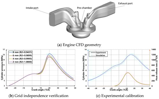 Based on the boundary conditions provided by the one-dimensional simulation software GT-POWER, this study used the three-dimensional computational fluid dynamics software CONVERGE to describe the flow, heat transfer, and combustion phenomena. The spatial discretization of the transport equations adopted the second-order upwind numerical scheme. The time integration took the implicit format, with the time step determined by the Courant–Friedrichs–Lewy condition. The PISO algorithm was used for the pressure–velocity coupling. On the other hand, the RNG k-ε model was used for turbulence simulation because it is effective and can reproduce statistically averaged flow patterns of the LES model (Table 4). The ignition process adopted the source/sink model, releasing 40 mJ of ignition energy in each cycle. Figure 3 shows the computational domain, of which the hybrid meshing process used adaptive refinement to capture the temperature and velocity gradients. The grid independence verification shows that, when the elemental size was below 4 mm, the cylinder pressure became consistent. The G-Equation modeled the flame dynamics, and the laminar flame velocity was corrected to match the experimental cylinder pressure and heat release rate curves.