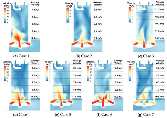 Velocity contours in the pre-camber of 7 cases at −9°CA during scavenging.
