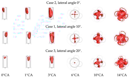 The lateral angle of the PC nozzle determines the scavenging efficiency, affecting the subsequent jet ignition process. However, the direct effect of the lateral angle on the jet orientation and penetration distance is relatively insignificant. Figure 7 shows the flame front propagation process for different lateral angle schemes. When the lateral angle is set to 10°, Case 1 presents the highest scavenging efficiency and the fastest flame propagation. However, because the swirl in the PC of Case 1 is not stable enough, the initial flame kernel develops asymmetrically. The flame does not spread evenly throughout the upper left side of the PC with the highest residual gas fraction. Although the asymmetric development of the initial flame kernel causes the jet to be uneven at 6°CA, as the combustion continues, the jet ignition becomes gradually uniform at 10°CA. Case 2, with a lateral angle of 0°, exhibited similar properties. The flame propagation of Case 2 is slightly lower than that of Case 1, but the jet symmetry is better due to the kinetic energy loss caused by the impact of the airflows.