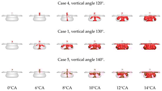 Similarly to the lateral angle, the PC vertical angle can also affect jet ignition by determining the scavenging process. However, the vertical angle also has a more profound effect. The angle can affect the flow distribution in the squish and bowl areas by changing the jet orientation to control the flow separation at the piston throat. Figure 8 shows the flame front propagation process of different vertical angle schemes. The small-radius swirl in Case 4 and the low-height swirl in Case 5 reduce the scavenging efficiency and slow the flame propagation. When excluding the combustion phase difference in the three schemes, a direct comparison of Case 4 (12°CA), Case 1 (8°CA), and Case 5 (10°CA) shows that there are significant differences in the flow separation at the piston throat of each scheme. Case 4 has a minimum vertical angle of 120°, the jet orientation is biased toward the bottom of the piston, and the flame front fills the bowl area first. As the pressure in the bowl area increases, the jet deforms and is squeezed into the squish area. Case 5 has a maximum vertical angle of 140°, the jet orientation is biased towards the top of the piston, and the flame front first fills the squish area and then gradually develops towards the bowl area. Case 1 is a compromise between the first two schemes. The flame front reaches the bowl and squish areas almost simultaneously, finally filling the entire MC. Therefore, the PC with an optimized vertical angle has a short combustion duration and high stability.