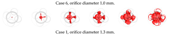 The orifice diameter determines the scavenging efficiency and the jet velocity. In Figure 9, Case 6 has the lowest orifice diameter of 1.0 mm. The cross-sectional area of Case 6 is also the smallest, which significantly affects the scavenging efficiency. The ignition process is delayed, due to a large amount of residual gas in the PC. In the subsequent jet ignition process, driven by the considerable pressure difference, although the small orifice diameter increases the jet velocity, the benefits have approached the limit, which cannot offset the combustion phase delay that occurs at the initial stage of ignition. Case 7 has the largest orifice diameter of 1.6 mm. This case has the highest scavenging efficiency, but the unburned gas is more likely to escape as a cold jet, resulting in a decrease in the pressure and a short jet penetration distance. A short jet penetration distance increases the combustion duration and reduces flame uniformity. There is an optimal orifice diameter, considering the scavenging efficiency and the jet velocity, so that the combustion phase and jet penetration distance can meet the requirements. In the research of Antolini et al., the passive PC, with an orifice diameter of 1.2 mm, presents the fastest natural gas combustion speed, significantly higher than that of 1.0 mm and 1.5 mm, which is approximately consistent with the results of this paper.
