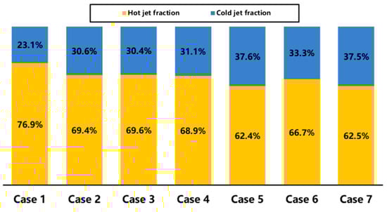 Mass fractions of cold and hot jets for 7 cases during jet ejection.