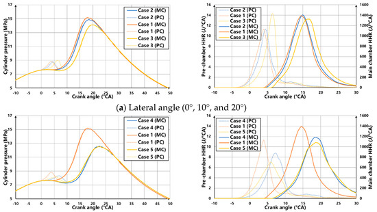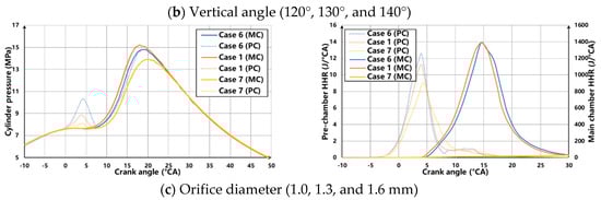 Figure 11 shows the MC and PC pressure and heat release rate curves of the cases during combustion. After ignition, the PC pressure increases, accompanied by cold and hot jets entering the main combustion chamber. Then, the pressure of the MC decreases slightly before burning, due to the downward movement of the piston. After jet ignition, the MC pressure rises rapidly and exceeds that of the PC. At this time, part of the gas mixture flows back into the PC. After the backflow finishes, the pressures of the MC and the PC are gradually balanced. The PC nozzle’s lateral angle, vertical angle, and orifice diameter significantly impact the in-cylinder pressure, which is mainly reflected in the pressure peak and change rate. Figure 11a compares the in-cylinder pressure and heat release rate curves for lateral angles of 0°, 10°, and 20°. Appropriately increasing the lateral angle can improve the combustion phase and pressure peak. Still, as the angle increases and exceeds the critical value, the ignition energy decreases significantly, accompanied by an increase in the ignition delay. On the one hand, the center of the stable swirl is prone to retain the residual gas. On the other hand, the inherent pressure gradient of the swirling flow is opposite to the pressure wave generated by combustion, which is unfavorable for jet injection.