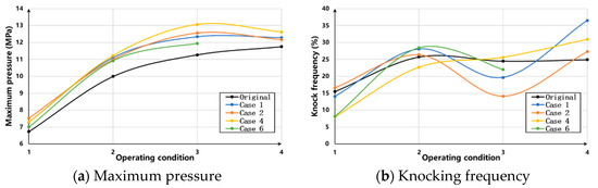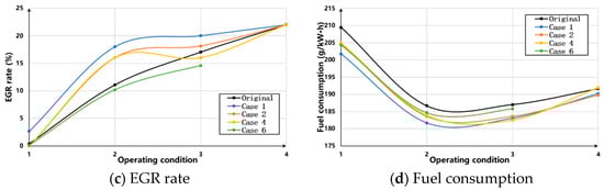 After simulation ranking, four schemes are selected. The maximum pressure, knock frequency, EGR rate, and fuel consumption of the schemes and the original engine are tested on the bench, as shown in Figure 12. After the PC retrofit, the maximum pressure of the engine increases, while the knock remains near the original level. The EGR rate of Case 1 is significantly improved under operating Condition 2, i.e., under normal power. However, under the rated power of operating Condition 4, due to the high PC temperature affecting the scavenging charge, each scheme’s EGR rate is challenging to increase compared to the original engine. It is worth noting that, under the joint influence of high PC temperature and small orifice diameter, the misfire phenomenon occurs in Case 6 under operating Condition 4. Finally, the PC retrofit presents significant economic advantages over the original engine. The fuel consumption rate can be saved up to 13.2% under normal power; however, the benefit relatively decreases under low load or rated power conditions.