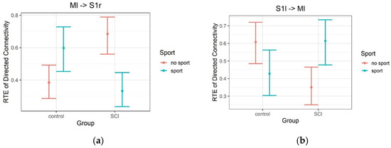 Directed connectivity during the condition movement, the sound beep, and the frequency beta from (a) PMCr to M1r, and (b) S1l to PMCr. SCI = spinal cord injury, RTE = relative treatment effect, Mr = right primary motor cortex, S1l = left primary somatosensory cortex, PMCr = right premotor cortex.
