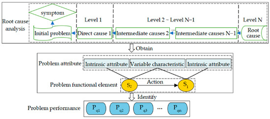 In this study, root cause analysis tools were employed to identify the components causing the issue and their corresponding problem attributes, thus leading to the identification of the problem performance of the product. Problem attributes comprise the intrinsic attributes and the variable characteristics of components or supersystems [44]. The process of identifying the problem performance of the product is illustrated in Figure 1.