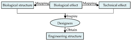 - Inspiration. Researchers study the biological structure that implements a function similar to the problem functional element through the biological effect and seek the corresponding technical effect of the biological effect in the engineering field. Through technical effects and biological structures, designers derive inspiration to identify engineering structures that can achieve similar functions. The process of obtaining the principal solution through inspiration is shown in Figure 5.