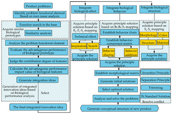 The integrated innovation mechanism inspired by multi-biological knowledge is an innovation process that integrates multi-biological features with products. This process commences with the existing issues of the product, selects advantageous biological features via acquiring biological prototypes and analyzing biological performance, and then integrates the selected multi-biological features into the product to form a new product. Its implementation principle is shown in Figure 3, and the specific process is as follows.