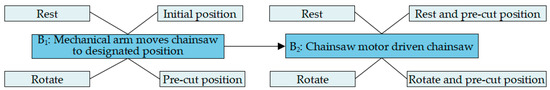 When building the conceptual structure, the obstacle-clearing mechanism was positioned at the lower segment of the mechanical leg to enhance the range of obstacle clearance, but this interfered with the robot’s mobility. To solve this problem, the TRIZ theory was applied to resolve the technical conflict. A solution was found: a platform flip hydraulic cylinder was installed under the obstacle-clearing support platform, and a rotating platform was set up between the sliding platform and the chainsaw motor, as shown in Figure 21. After the obstacle was cleared, the hydraulic cylinder of the sliding platform contracted, moving the sliding platform to its inner limit position. The rotating platform then pivoted, causing the chainsaw motor and chainsaw to rotate 90° clockwise. Subsequently, the platform flip hydraulic cylinder extended, causing the obstacle-clearing support platform to tilt inward, thus retracting the obstacle-clearing mechanism. After incorporating the platform flip hydraulic cylinder and the rotating platform, the final product concept structure was obtained, i.e., a soil-lifting six-legged firefighting robot.