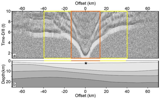 Comparison between narrow aperture (orange) and wide-aperture (yellow) seismic recording (a) for a crustal-scale exploration of the entire crust (b), which in the example is about 25 km thick (figure modified from Wei et al. [34]). The star indicates the position of the seismic source. Generally, a narrow-aperture array has the same or less aperture of the deepest reflector to be imaged, while a wide aperture is about 4 times larger than the maximum depth.