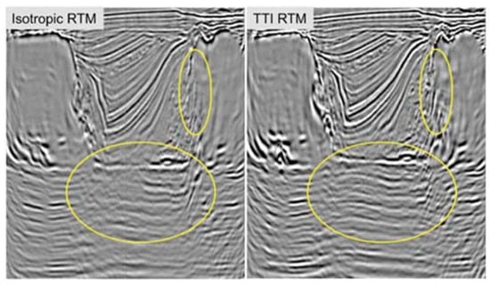 Comparison between results of subsalt RTM using an isotropic and tilted transverse isotropic (TTI) velocity model (from Huang et al. [83]). The yellow ellipses show the areas improved in imaging using a TTI model.