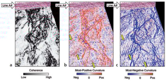 To conclude, this attribute can effectively identify small-scale faults and fractures that may not be detectable with other attributes (e.g., Sigismondi and Soldo, [104]). For instance, Lisle [105] successfully correlated fractures measured on an outcrop to curvature values.