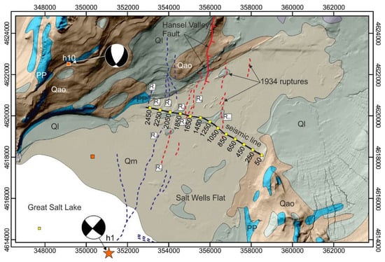 The study of Bruno et al. [131] aimed to assess the origin of the ruptures occurred during the 1934 Hansel Valley earthquake to gain insights into the way complex fault ruptures accommodate regions of continental extension and transtension. By employing a 6.6 km-long, high-resolution seismic survey, Bruno et al. [131] found that the 1934 surface ruptures were not secondary in nature but represented the direct expression of coseismic deformation along numerous shallow faults beneath the valley floor. The seismic data indicate a complex tectonic framework for Hansel Valley, characterized by diffuse faulting and a broad negative flower structure that extends to depths of at least 1 km. Their results suggested that normal–oblique slip faulting is active in Hansel Valley, which is consistent with geological observations made shortly after the earthquake and focal mechanisms [134] implying primarily left–lateral, strike–slip faulting at a seismogenic depth of approximately 8.5 km.