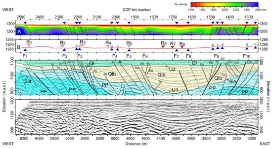 Seismic interpretation of the first 500 m of the post-stack migrated seismic profile of the western portion of the basin ((C): CDP 1250–2540) overlain and compared with the uninterpreted seismic data (D) and with the results of Vp refraction tomography (A). All images are plotted with the same horizontal and vertical scale. Elevations (B) have instead a vertical exaggeration of ~12.5%. Blue triangles indicate the surface projection of interpreted faults; red triangles show the location of the surface ruptures associated with the 1934, M 6.6 earthquake and intersecting the seismic profile. Pink triangles are surface ruptures projected on the seismic line. For rupture locations, see Figure 8. All other symbols and seismic units and unconformities are the same as in Figure 8. Modified from Bruno et al. [129].