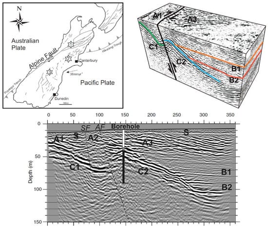 (Upper left): Plate tectonic setting of New Zealand’s South Island showing the west-directed Hikurangi subduction zone in the north, the east-directed Puysegur subduction zone in the south, and the Alpine Fault (modified from Kaiser et al. [16]). Also labeled with (1) is the northern section of the Alpine Fault zone, i.e., site of the ultra-high-resolution investigation conducted by Kaiser et al. [16]. (Upper right): Migrated pseudo-3D volume, highlighting the Alpine Fault strand and geological units A1-to-C2 discussed in Kaiser et al. [16]. (Lower panel): Migrated and depth-converted ultra-high-resolution 2D section showing a borehole intersects gravels (white), an unidentifiable zone (gray), and schist basement (black) in which it terminates at 83 m (from Kaiser et al. [16]).