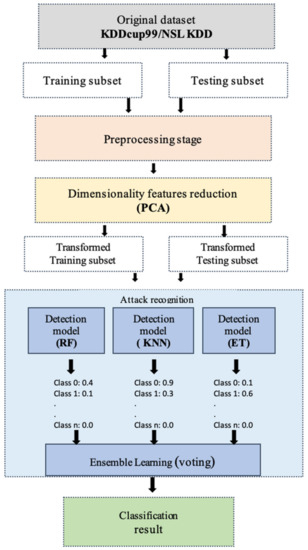 This paper presents a novel approach to developing an IDS that can detect various types of attacks. It can be carried out through a Principal Component Analysis (PCA) method that eliminates redundancy and reduces the system’s dimensionality. The proposed model shows how to improve the performance of an IDS by implementing an ensemble model. This method combines multiple decisions from multiple classifiers (Extra Trees (ET) [5,6], K Nearest Neighbors (KNN) [7,8], and Random Forest (RF)) into one model [9,10]. The model is based on an Average-of-Probabilities (AOP) vote combination rule.