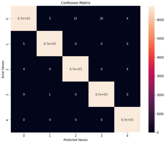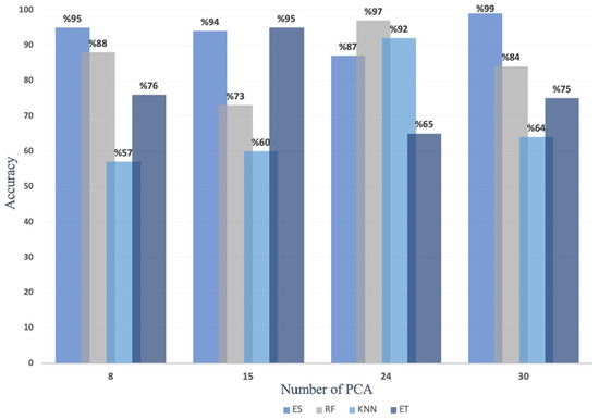 As shown in Figure 2, the performance of the Ensemble models was not improved after 30 PCAs and 24, 24, and 15 PCAs for RF, KNN, and ET, respectively. The performance of the ensemble method obtained the maximum accuracy rate of 99.89% with 30 PCAs and exceeded all other individual classifiers. In contrast, the best accuracy of the RF, KNN, and ET classifiers were 97.85%, 92.65%, and 95.45% with 24, 24, and 15 PCAs, respectively.
