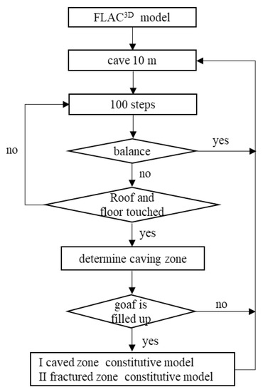 The calculating process of the numerical simulation model is demonstrated in Figure 1. During the simulation, some routine checks were performed every 100 steps after the calculation initiates. When the equilibrium state is reached, the next 10 m will be excavated. Before the model reaches equilibrium, with the roof and floor contacting, the next 10 m will be excavated also. In other cases, the next 100 steps are expected to be iterated, leading to the next preformation. The calculation will be terminated when all coal seams are mined and an equilibrium is reached. The gangue in the caved zone is assigned to the double-yield constitutive model with the strength of the surrounding rock in the fractured zone reduced.