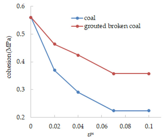 The piecewise function of the cohesion and internal friction angle of the surrounding rock versus the shear plastic strain can be used in FLAC3D to simulate the improvement of the overall strength of the fractured surrounding rock by grouting. For the low-strength surrounding rocks, the post-peak strain softening mainly shows a decrease in cohesion. From the peak strength to the residual strength, the cohesion is reduced by about 50%, while the internal friction angle basically stays unchanged [33]. According to the research of Lu and Liu [38,41], the coal strain-softening parameters in the numerical simulation are shown in Figure 2.