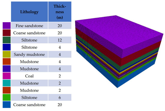The model includes a total of 744,980 nodes and 701,400 blocks. In order to improve the simulation accuracy, the coal seam, immediate roof and immediate floor grids are appropriately densified with a block size of 0.5 m length × 1.0 m width × 0.5 m height. A pressure of 16.8 MPa is applied to the upper boundary of the numerical simulation model, with displacement constraints applied to the other five faces. The model meshing is shown in Figure 4.