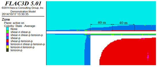 FLAC3D is an effective tool suitable for simulating the nonlinear and large deformation behavior of geotechnical materials and their supporting structures, especially for simulating the plastic flow of materials after yielding, which has been widely used in the stability analysis of the surrounding rock of the retained roadway [15,16]. In this study, the FLAC3D was adopted based on multiple constitutive models such as the double yield, plastic softening, Mohr–Coulomb and corresponding algorithms to construct a dynamic numerical method to simulate the stability of retained roadway surrounding rock. In addition, the plastic zone development in the roadway during the process of roadway deformation and the optimal grouting timing of the fragmented coal rib were studied.