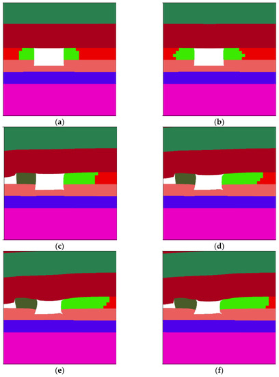 Grouting diffusing range development during mining. (a) 30 m before working face. (b) 10 m before working face. (c) 10 m behind working face. (d) 30 m behind working face. (e) 60 m behind working face. (f) 100 m behind working face. Note:
