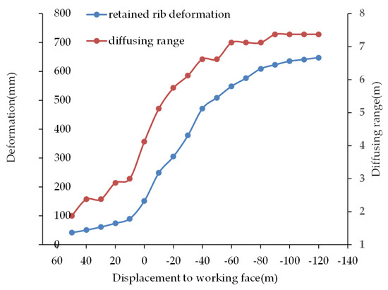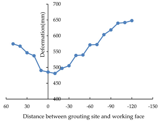 Grouting in retained coal rib was carried out at different distances from the working face in this simulation. If grouting is performed at different sites before and after the working face, Figure 8 shows the deformation of the retained coal rib when the grouting position is 120 m behind the working face. On the whole, whenever grouting was used to consolidate the fragmented surrounding rocks, the deformation of the retained coal rib was effectively controlled to varying degrees, as shown in Figure 8. The curve in Figure 8 presents a “U” shape, indicating an optimal timing of grouting in the retained coal rib of pillarless mining.