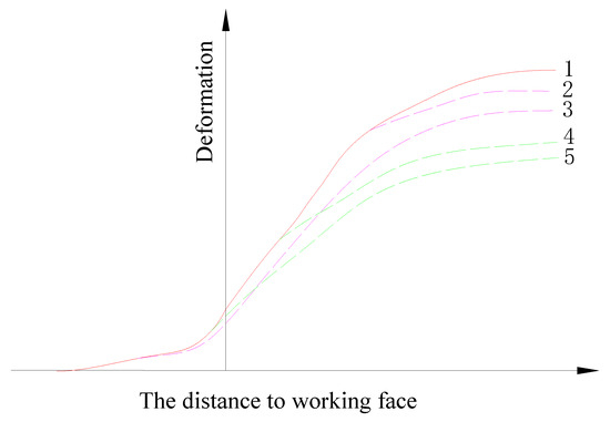 The principle of optimal grouting timing in the retained coal rib of pillarless mining is shown in Figure 9. The solid line 1 in the figure represents the deformation of the retained coal rib without grouting reinforcement, and the dashed lines 2–5 represent the deformation of the retained coal rib after the grouting is carried out at different sites before and after the working face.