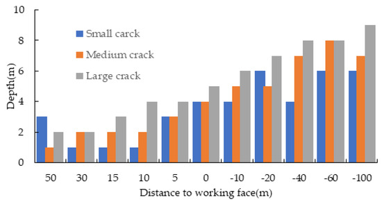 With the advancement of the working face, cracks gradually penetrated into the retained coal rib. As the coal rib displacement increased, some tensile failures were observed in the roadway surrounding rock. In the area of 10 m depth before the working face, the plastic zone began to expand under the influence of mining-induced stress. The mining-induced stress caused a large number of new cracks in the retained coal rib and caused the original cracks to expand further. Since the roadway adopted the active strong bolting support, and the main roof above the roadway was not fragmented or rotated and subsided, the range of the plastic zone in coal rib had not been greatly expanded at this time.