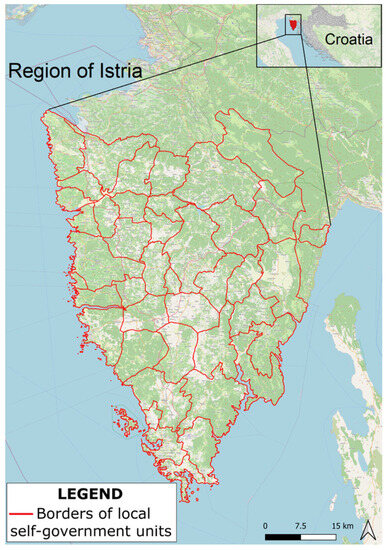 The region of Istria is the largest Adriatic peninsula, located in the most western part of Croatia. It is surrounded by the sea on three sides and a northern border towards the mainland. It is formed by the line between the Bay of Milj (Muggia) in the immediate vicinity of Trieste and the Gulf of Preluka in the immediate vicinity of Rijeka. The area is located between 45°35′ N; 13°43′ E and 45°21′ N; 14°99′ E, and it extends to the south in the shape of a triangle on the Adriatic Sea (44°45′ N; 13°55′ E). (Figure 1). According to the last population census (2021), the region of Istria has a total area of 2813 km2, with 195,237 inhabitants living in 10 cities and 31 municipalities [18]. Along the coast of Istria, the dominant climate is Mediterranean, which, due to the cold air flowing from the mountains and the proximity of the Alps, gradually changes towards the interior and becomes continental. Geographically, Istria is usually divided into three parts: Red Istria (west coast), where red-brown soil predominates; Grey Istria (central Istria) due to the grey clay soil; and White Istria (the slopes of the mountain Učka on the eastern part of the peninsula) because of the stony soil.