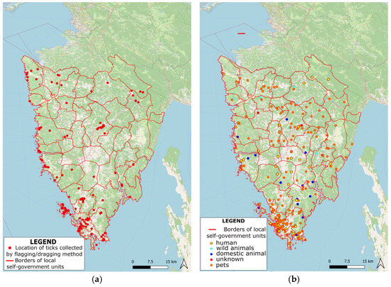 Distribution of ticks collected using (a) flagging/dragging method and (b) animal/human host method across the region of Istria.