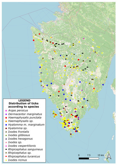 Map representation via GIS allows for the visualization of the spatial distribution of the collected ticks. By georeferencing the sampling locations and overlaying them as tick abundance data, GIS can generate thematic maps that clearly and intuitively illustrate the distribution patterns. These visual representations enable the identification of hotspots, areas of high tick density, and spatial variations across the study area. Spatial analysis can reveal patterns and relationships between tick distribution and environmental factors such as land cover, vegetation type, climate data, or topography [17]. By using this mapping method, public health authorities and vector control agencies can focus their efforts on implementing interventions, such as targeted pesticide applications, public awareness campaigns, or habitat modifications in specific areas [22]. This integrated analysis can offer insights into the potential risk factors of tick-borne diseases and help prioritize surveillance efforts. Advances in mapping via GIS, with concluded progress in spatial and space–time modelling, also provided other investigations conducted in Iran and Colorado, USA, showing new opportunities to prevent and control emerging vector-borne diseases [23,24]. All collected ticks were subsequently identified to the species level and categorized according to gender or developmental stage (e.g., larvae, nymphs, and adults). The determined tick species collected using the flagging/dragging method are presented in Table 2.