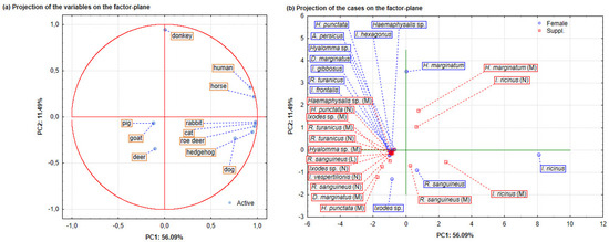 Distribution of tick species according to gender and developmental stage collected using different host methods represented via principal component analysis (PCA) (n = 929) with two main components (PC1 and PC2). Projections of (a) the analysis variables (hosts) and (b) cases (active cases variable: gender/development; labelling variable: tick species) on the factor plane.