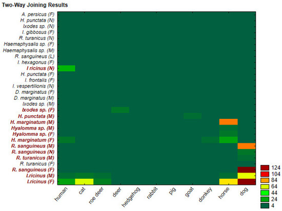 In the graph, the dependence of tick species (y-axis) and hosts (x-axis) with different colours, from dark green to dark brown, are shown. Certain numerical values within 4 and 124 correspond to specific colours. Our analysis enables the grouping or clustering of data to be displayed simultaneously rather than successively in rows and columns. The most important advantage of such a simultaneous approach is that it is possible to determine the connections between two sets of data. The main goal of the clustering method is data reduction with a minimal loss of information. Categorical predictor/criterion data were used as the target information, which consists of the number of interactions, which is implied by predicting the data input based on categorical row (tick host) and column (tick species) variables. The model is based on the use of correlation analysis of 29 (tick species) × 11 (hosts) dependencies according to the data matrix of the situation obtained from the analysis of the tick species identification of an individual host. The results are presented graphically in a “heat map”. The analysis reveals strong associations of the host dog (cluster of 11 rows) with the tick species Ixodes ricinus (F) and Rhiphycephalus sanguineus (F) (first and third cluster of the column), with a score of 124. Furthermore, strong clusters are observed between the host dog (cluster of 11 rows) and the tick species Rhiphycephalus sanguineus (M) (seventh cluster of the column) as well as between the host horse (cluster of 10 rows) and the tick species Hyalomma marginatum (M) (11th cluster of the column) with a score of 84. The remaining clusters had weaker associations. Therefore, they were not explained in more detail.