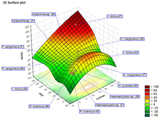 In addition, the dependence of the most represented tick species on three hosts (human, dog, and horse) is shown as a three-dimensional (3D) surface plot obtained using PCA (Figure 6).