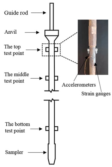 In terms of the probe rod used in the field SPT, the outer diameter is 50 mm, the inner diameter is 31 mm, the density is 7.85 × 103 kg/m3, and the elastic modulus is 2.11 × 1011 Pa. A total of three strain and acceleration test points are arranged along the rod, which are, respectively, 0.5 m away from the anvil at the top of the rod, at the water–soil contact surface, and 0.5 m above the rod bottom penetrator, as shown in Figure 2. The strain of the probe rod is measured by 120-3AA-type strain gauges. Each measuring point is arranged with four strain gauges at right angles and connected by the full bridge method. The acceleration of the probe rod is measured by the acceleration sensor, and its maximum range is 4.5 × 104 m/s2, which meets the test requirements. The strain and acceleration data are collected by the DH5922D dynamic signal data collection system, which includes eight data collection channels. The maximum continuous sampling rate is 200 kHz, which can meet the requirements of dynamic strain and acceleration data collection in the test.