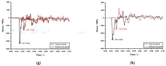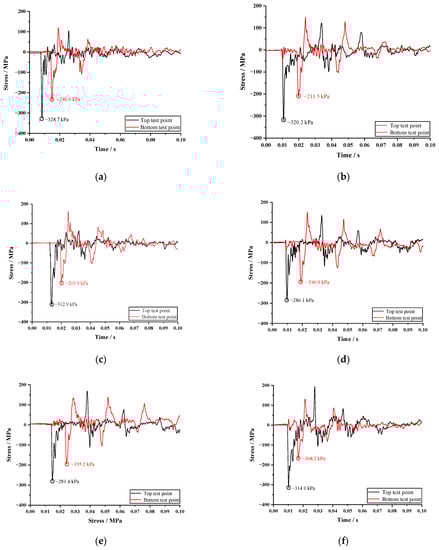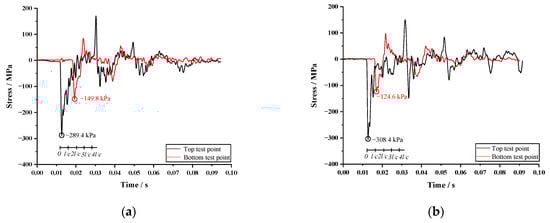 Figure 4 shows the effect of survey depth on the axial stress at the top and bottom test points of the probe rod under a water depth of 15 m. As can be seen from Figure 4, there is a significant difference in the magnitude of peak stress between the top and bottom test points of the probe rod. The axial stress at the bottom test point is notably smaller than that at the top test point. For example, at a survey depth of 10 m, the peak stress at the top test point is 308.4 MPa, while the peak stress at the bottom test point is 124.6 MPa, a reduction of 59.6%. With the increase in the length of the probe rod, there is no significant difference in the peak stress at the top test point, and the peak stress at the bottom test point decreases with the increase in the rod length. Compared with the test group with a survey depth of 10 m, the stress at the top test point was reduced by 4.8% and the stress at the bottom test point was reduced by 11.5% for the test group with a survey depth of 20 m.