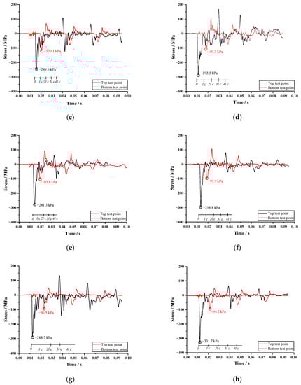 Relationship between axial stress of probe rod and time under different water depths. (a) Water depth of 7.1 m; (b) water depth of 8.9 m; (c) water depth of 11.1 m; (d) water depth of 11.6 m; (e) water depth of 15.0 m; (f) water depth of 17.1 m; (g) water depth of 19.4 m; (h) water depth of 20.7 m.