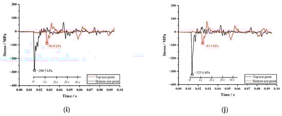 Relationship between the axial stress of the probe rod and time. (a) Survey depth of 5 m; (b) survey depth of 10 m; (c) survey depth of 15 m; (d) survey depth of 20 m; (e) survey depth of 25 m; (f) survey depth of 30 m; (g) survey depth of 35 m; (h) survey depth of 40 m; (i) survey depth of 45 m; (j) survey depth of 50 m.