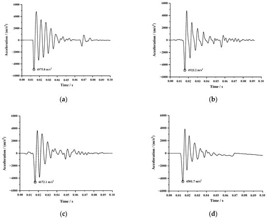 Figure 5 shows the variation curve of the probe acceleration with time for different rod lengths. With the increase in rod length, the peak acceleration of the rod decreases obviously. For the test group with survey depth of 5–50 m, the peak accelerations are 4975.8, 4923.2, 4672.1, 4501.7, 4399.1, 4267.5, 4192.3, 4087.2, 3957.8, and 3952.7 m/s2, respectively.