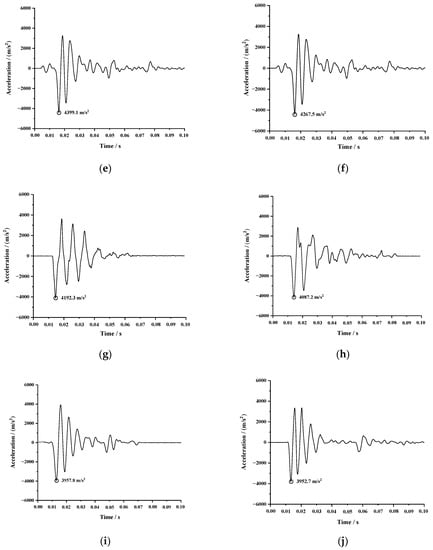 Relationship between probe rod acceleration and time. (a) Survey depth of 5 m; (b) survey depth of 10 m; (c) survey depth of 15 m; (d) survey depth of 20 m; (e) survey depth of 25 m; (f) survey depth of 30 m; (g) survey depth of 35 m; (h) survey depth of 40 m; (i) survey depth of 45 m; (j) survey depth of 50 m.