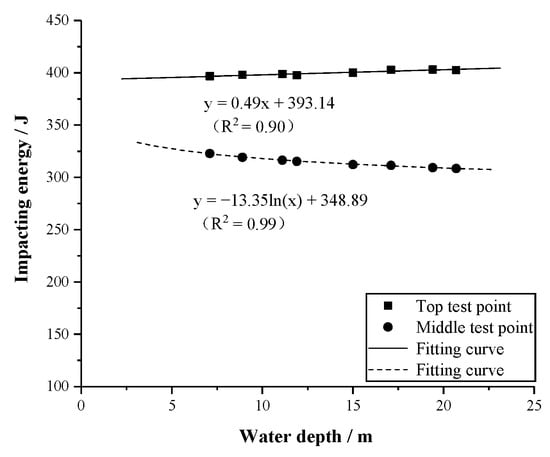 By fitting the data in Figure 6, the relationship between the hammer impacting energy and probe rod length at the top of the probe rod and water–soil contact surface can be obtained:
