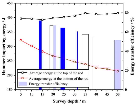Figure 7 shows the influence of survey depth on the distribution law of hammer impacting energy under 15 m water depth. Table 2 shows that the hammer impacting energy at the top test points increases with the increase in survey depth. For the test group with a survey depth of 5–50 m, the hammer impacting energies at the top test points are 396.7, 396.2, 392.8, 398.2, 401.2, 406.9, 414.6, 411.3, 412.3, and 414.7 J, respectively, and the energy transfer efficiency at the rod top test points of each test group is 83.8, 83.7, 83.0, 84.1, 84.7, 85.9, 87.6, 86.9, 87.1, and 87.6%, respectively. The hammer impacting energy at the bottom test points of the probe rod gradually decreases with the increase in the probe rod. The energy transfer efficiency at the top and bottom test points was 81.0, 76.1, 71.9, 66.9, 64.4, 60.5, 57.5, 55.0, 53.8, and 51.6%, respectively.