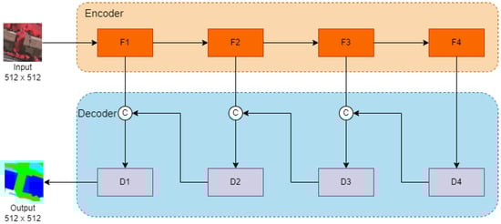Ronneberger et al. [] proposed a convolutional neural network called U-Net for segmenting biomedical images. This architecture has been widely used and adapted for various segmentation tasks, including regular image segmentation, medical image segmentation, and remote sensing image segmentation. The U-Net architecture follows an encoder-to-decoder concept, where the encoder is responsible for extracting high-level features from the input image through multiple convolutional and downsampling operations. The downsampling can reduce the spatial resolution of the feature maps while increasing their receptive fields, allowing the network to capture context and global information.