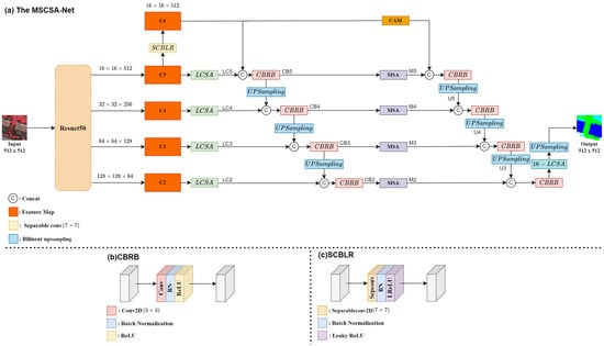 We propose a new end-to-end neural network model called the multi-scale channel spatial attention network (MSCSA-Net) for semantic segmentation of remote sensing images. The architecture of MSCSA-Net is depicted in Figure 2a and was mainly inspired by the encoder–decoder architecture.