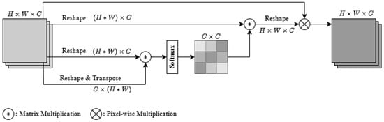 This modified CAM uses reshape to reorder the feature maps on three branches. The third branch uses transpose to perform matrix multiplication with the second branch and the softmax function to obtain the feature tensor of . Then, the feature tensor of is multiplied with the reshaped feature from the first branch to obtain the enhanced channel feature tensor. Finally, the enhanced channel feature tensor is multiplied by the input feature for the output.