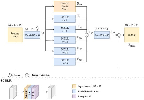 The input feature map is passed through a convolution with a channel reduction rate d applied to the channel number, which aims at reducing the dimensionality of the feature map, to obtain the dimension-reduced feature . The is passed through an SE block and five separable convolution batch normalization leaky ReLu (SCBLR) blocks with five different dilation rates (r = 1, 6, 12, 18, 24) to obtain different scales of receptive fields. The SCBLR block is also shown in the lower part of Figure 6, and it is formed of a separable convolution layer with kernel size , a batch normalization layer, and a leaky ReLu layer.