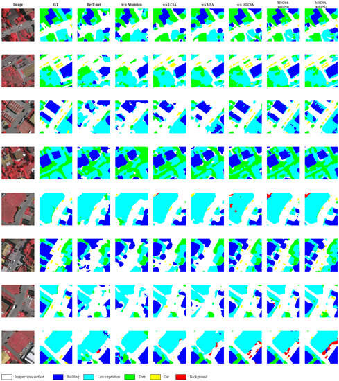 The second row shows the results of our proposed model without any of our designed attention modules (no LCSA, no MSA, no 16-LCSA). Compared with the results shown in the first row, one can see that the F1-scores for five categories (impervious surfaces, buildings, low vegetation, trees, and cars) were all higher than ResU-Net. The m-F1-score and mIoU were also better than ResU-Net. This means we could simply use our MSCSA-Net without attention modules to achieve better results than ResU-Net.