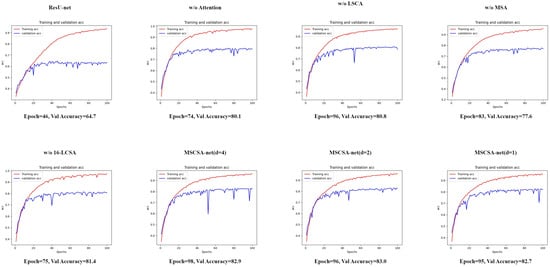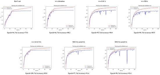 Then, we compared our model using any two of the attention modules. The third row shows the results for our proposed model without the LCSA module. The fourth row shows the results for our proposed model without the MSA module. The fifth row shows the results for our proposed model without the 16-LCSA module. These results were also much better than the results with ResU-Net. Among these three methods, MSCSA-Net without the 16-LCSA module also had the best performance and its m-F1-score could reach 82.4 and the mIoU could reach 70.0. This demonstrates that we can only adopt two of our designed attention modules, the LCSA and MSA modules, to achieve a higher m-F1-score and mIoU.