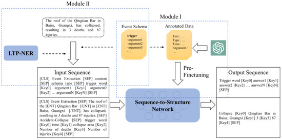 To address these drawbacks, some researchers had proposed joint model methods [13,23,24,25,26,27,28,29], which make full use of the interaction information of trigger words and event arguments and extract them simultaneously on this basis. Li et al. [13] implemented the joint learning of trigger words and event argument extraction tasks based on traditional feature extraction methods and obtained good results with a structured perceptron model. Nguyen [23] constructed local features for text sequences and local windows, and global features for between-event trigger words, between-event arguments, and between trigger words and event arguments based on bidirectional recurrent neural networks through deep and joint learning, thus improving the performance of the event extraction task. Lu et al. [27] defined information extraction as a generative model from sequences to structures, and proposed the Text2Event model as an example for the event extraction task, which is able to learn a parallel corpus containing knowledge structures directly, thus modeling all sub-tasks of event extraction uniformly. Compared to the pipeline model, the joint model methods can effectively utilize contextual information and model the interactions among multiple sub-tasks to correct errors in individual sub-tasks. However, the models above only improved the model from the perspectives of model structure and problem definition, overlooking the prior knowledge learned by pre-trained language models.